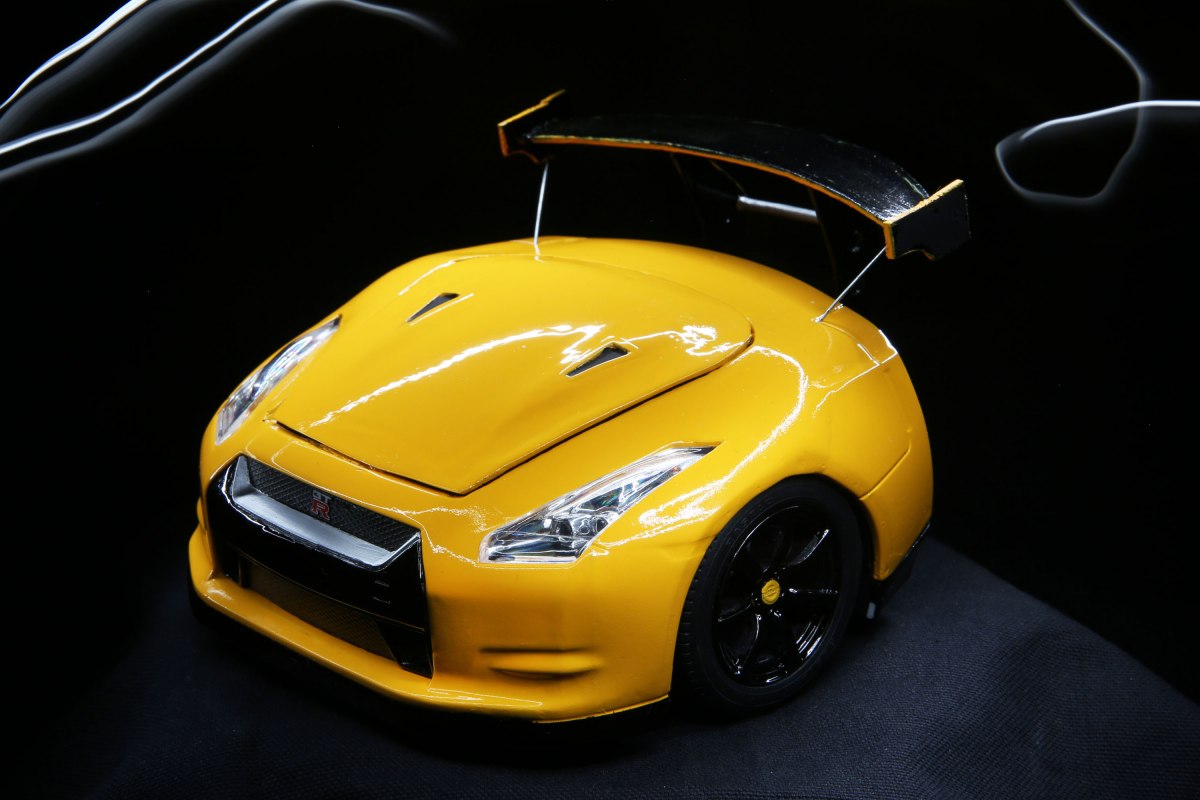 S – Oui c’est vrai ! Les maquettes c’est un délire, un passe-temps. Ça permet de passer sur du réel, sur de la 3D en s’affranchissant de la technique informatique. Ce qui est drôle c’est qu’il y a des gens de l’autre bout du monde qui m’en envoient. Notamment une Skyline Nissan GT-R qu’on m’a envoyée du Texas ! Mais attendez… (Soufyane part quelques instants et revient avec une maquette) C’est une maquette à monter soit même que j’ai traficotée dans mon coin ! C’était amusant, puis j’en ai fait de plus petites à partir de modèles télécommandés !